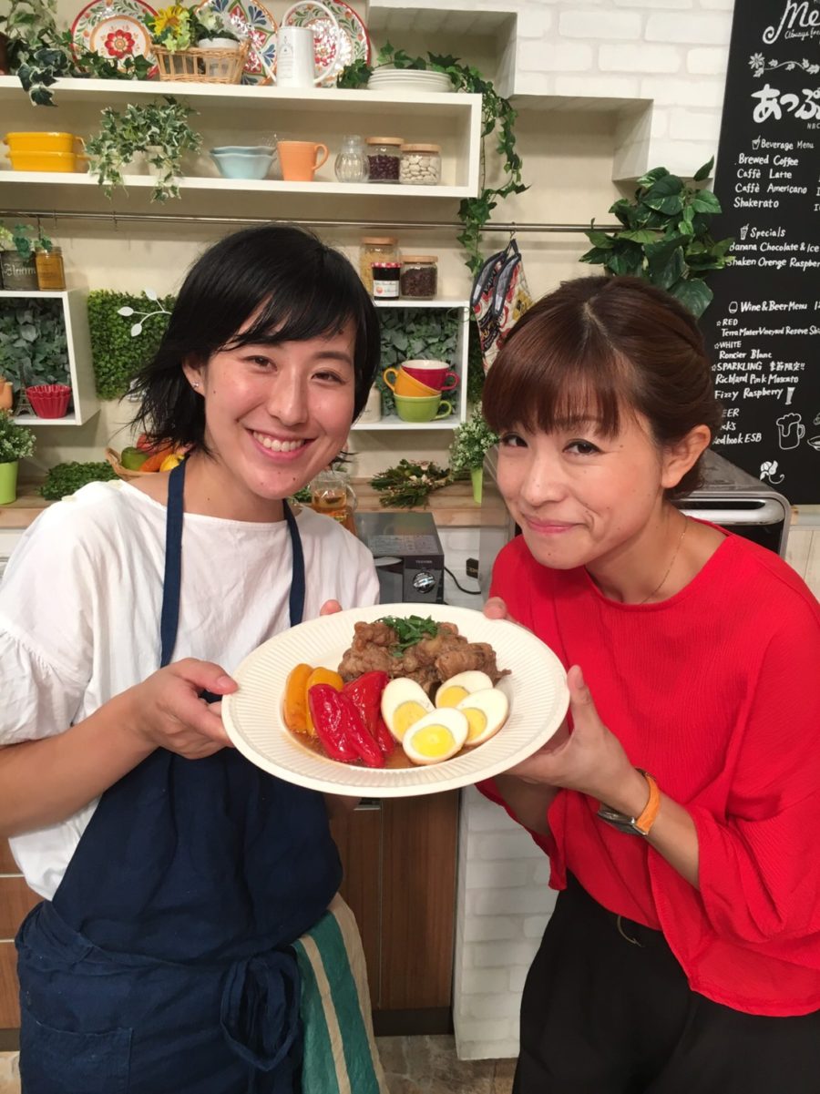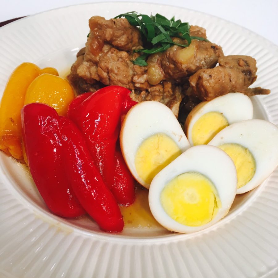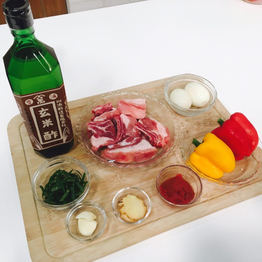 ① スペアリブは 5 cm長さに切っておく。パプリカは半分に 切って種とヘタを取り、手で平らにつぶしておく。 にんにくは縦半分に切って、生姜は皮付きのまま 2~3 mmの薄切りにする。梅干しは種を取って、ちぎって おく。大葉は細切りにする。 ② 鍋に湯を沸かし、1のスペアリブを入れて 10 分 下茹でし、ザルに上げて、水洗いし、水気をふき取って おく。茹でる時にたまごを一緒に茹でてもよい。 ③ 別鍋に A を入れてよく混ぜ合わせ、2のスペアリブと・ ゆでたまごを入れて、落し蓋をし、時々ひっくり返し ながら、弱火で 30 分煮る。 ④ ③が煮上がる直前に、1のパプリカを加え、5分程煮る。 ⑤ ④に火が通ったら、4のスペアリブと半分に切ったゆでた まごとパプリカを器に盛り、1の大葉を飾る。![]()